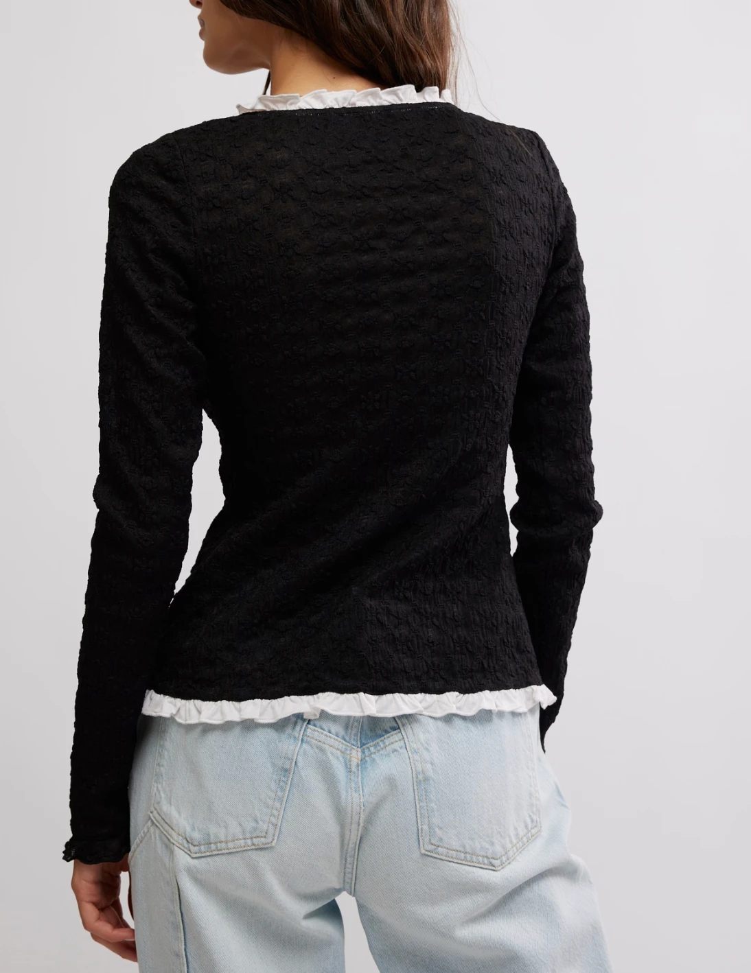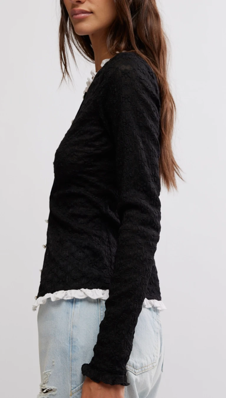 Features: Textured fabrication, scoop-neckline, long-sleeve style, button closures, delicate ruffled trim