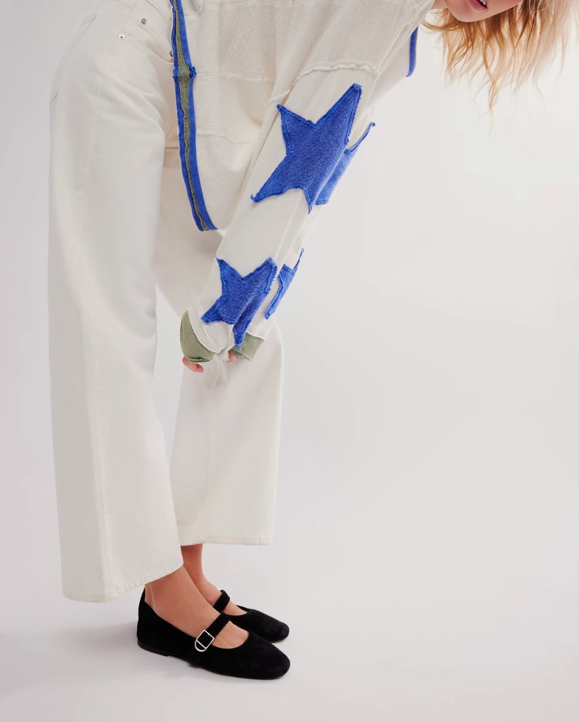 Features: Soft cotton fabrication, subtle scoop neckline, drop-shoulder sleeves, layered detail, raw trim, oversized star detail at sleeves, raised seaming