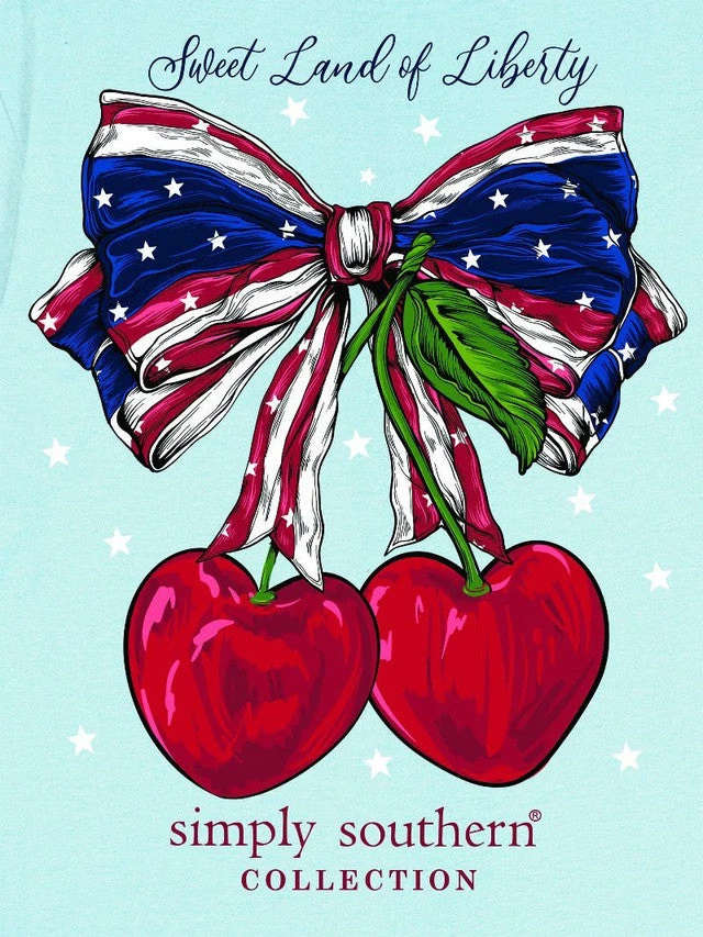 Ice blue short sleeve shirt with the phrase ‘Sweet land of liberty’ and a pair of cherries beneath a patriotic bow. Simply Southern logo below and on left chest. 100% cotton. Unisex sizing.