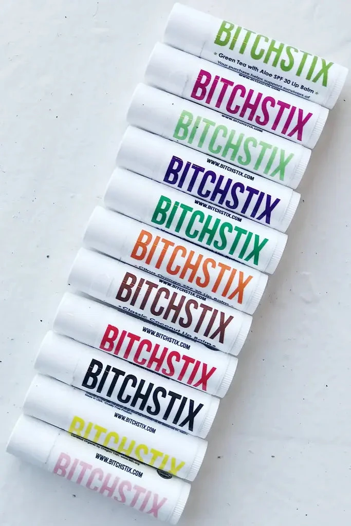 Bitchstix broad-spectrum Banana Kiwi SPF 30 Lip Balm protects lips from UVA and UVB rays. Made with aromatherapy-grade essential oils and organic ingredients like organic sunflower seed oil and organic coconut oil, they’ll leave your lips feeling soft and silky—and never chalky. Bitchstix SPF Lip Balms are also packed with antioxidant Vitamin E to moisturize and make lips smoother, plumper and softer. Cruelty-free and manufactured in the USA. Your purchase supports survivors of domestic violence and sexual assault.