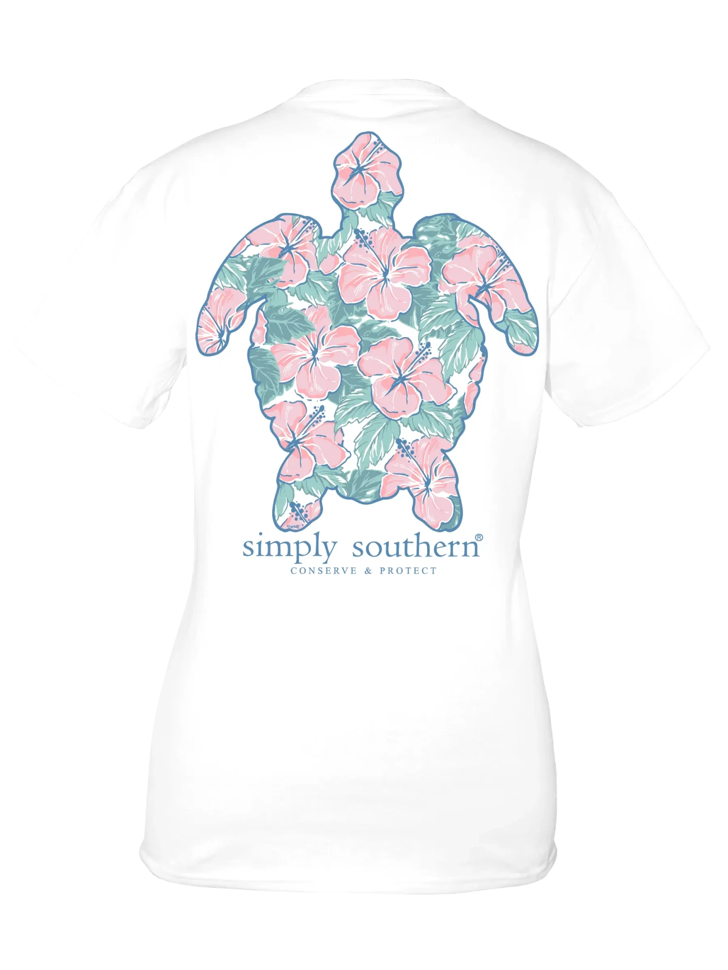 White short sleeve shirt with a tropical patterned sea turtle and the phrase ‘Conserve and Protect’. Simply Southern logo below and on left chest.